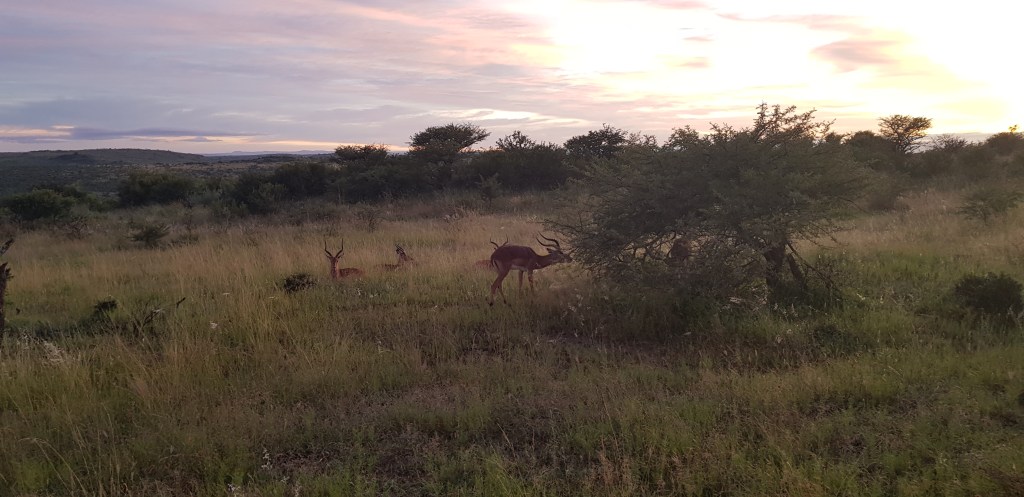 Aujourd’hui safari à 3h30 de Durban dans les terres à l’ouest, un endroit incroyable pour les initiés. Une réserve et 5 lodges différents sur cette réserve, on se refile l’adresse en espérant qu’il n’y aura jamais trop de touristes. Pour notre lodge 5 chambres , un service 5 étoiles, un cadre à couper le souffle et un apéro au milieu de nulle part après 2h30 de jeep avec un ranger qui connait sa réserve à la perfection. Nous on ne voit rien mais elle stoppe la jeep et nous montre dans les hautes herbes une pointe noire …puis une autre…une lionne… et un lion qui se dressera l’espace de 10 secondes …Magnifique, magistral ! On verra 2 léopards, des buffles, une girafe seule qui traverse la route et s’élance telle une ballerine dans la savane…On verra des gnous, des antilopes, différents oiseaux, un chacal …dans des immensités extraordinaires …Ici nous sommes chez les animaux …ici ce sont les rois !
