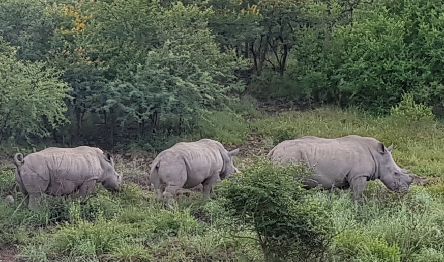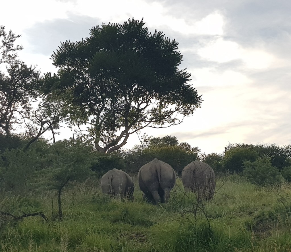 Nous repartons et soudain 1…2…3 rhinocéros très près de la jeep et qui nous montrent leurs derrières ! C’est dingue, nous verrons AUSSI 3 éléphants… et surtout nous admirerons cette savane à perte de vue et ce sentiment profond d’être NOWHERE . Un café muffin au sommet d’une colline, certains ajouteront une crème de whisky à leur café … à 7 h du matin …Nous sommes 5 dans la jeep et nous sommes ébahis par tant de beauté …Cette réserve dont je tairais le nom est un endroit EXTRAORDINAIRE mais il faut protéger ces animaux car partout en Afrique des braconniers rôdent…Cette faune est rare, ces animaux doivent rester en sécurité pour que toujours ils restent chez eux à l’écart des trafics en tous genres.