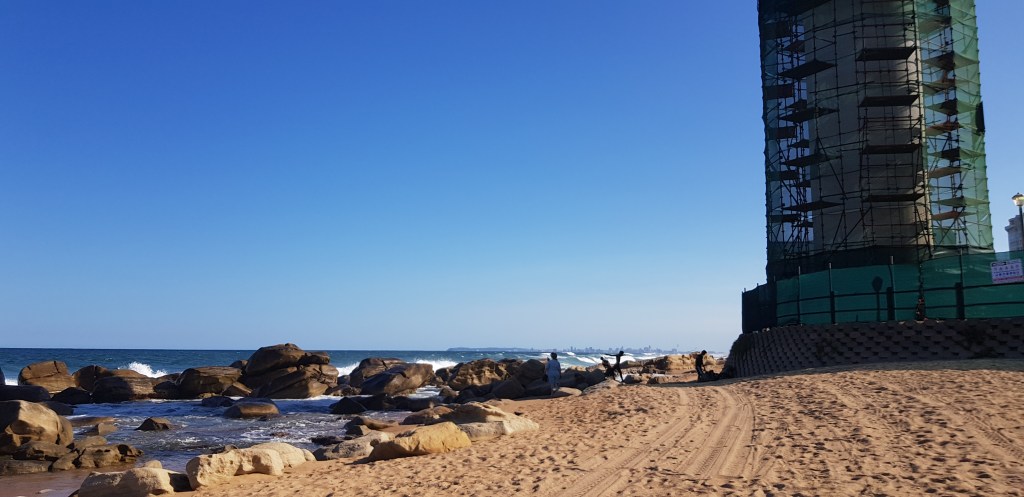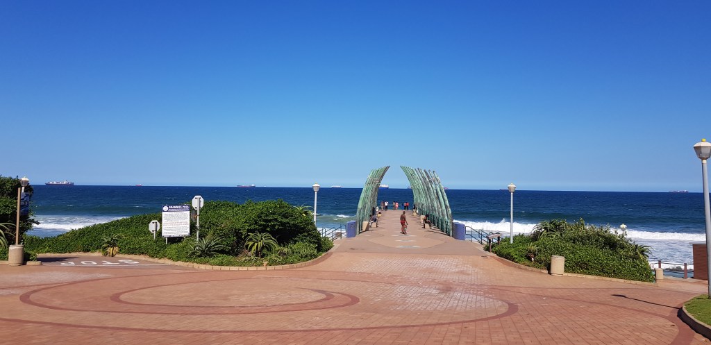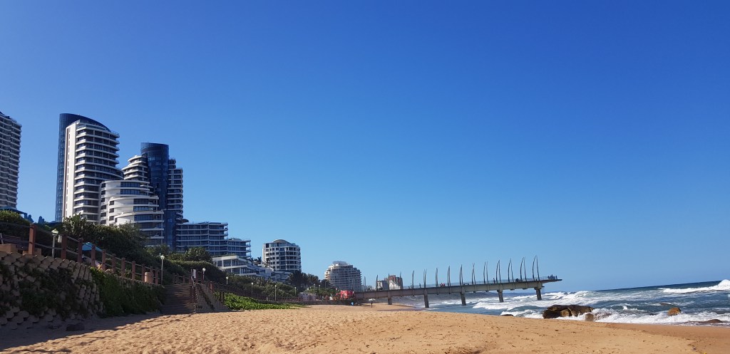 La plus belle plage de Durban c’est Umhlanga, le quartier des affaires et des beaux hôtels, le paradis des surfeurs mais aussi des Runners ! 7,4 kms de sentier qui longe la mer qu’on appelle aussi Golden Mile = Mile d’or. Une plage de sable fin et une eau chaude , nous sommes sur la côte Est d’Afrique du Sud et c’est le littoral de l’Océan Indien.