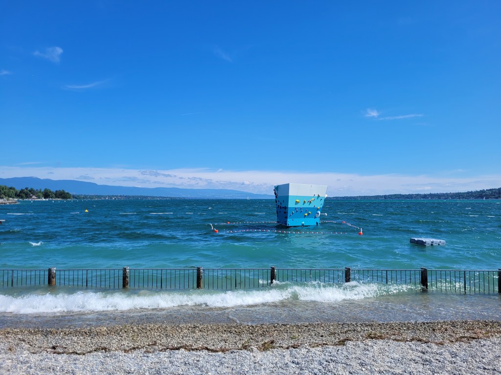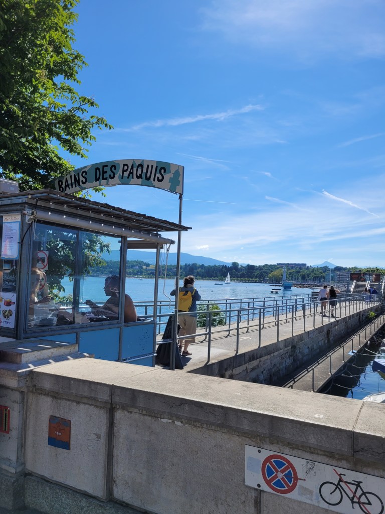 Après le Beau-Rivage et le désormais Richemont que j’adorais …on passe le pont des Paquis et pour 2 francs suisses par personne on a accès à la plage …Un restaurant avec des plats simples, des plateaux qu’on emporte sur la plage…Une jolie chanson qui vous rappelle de rapporter votre plateau et de jeter vos déchets …des couloirs de natation pour apprendre à nager …Une barrière sur le lac dans l’eau pour sécuriser les plus petits, un mur d’escalade pour les plus grands et même ce dimanche matin un récital de poésie…