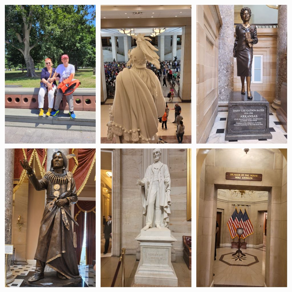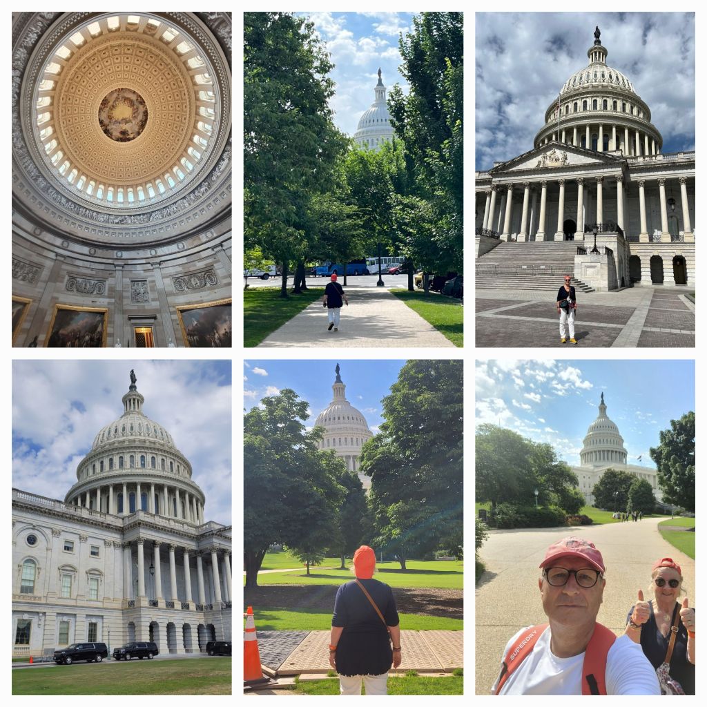 Un bâtiment immense qui surplombe des jardins et une pièce d eau en contrebas. Il faut absolument réserver. L’ entrée se fait en sous sol . Un passage se trouve au milieu de la façade de face. Ce capitole a été reproduit en plus petit modèle dans différents états d’Amérique. La salle de réflexion et sa gigantesque Coupole est impressionnante. Autour de ce cercle des statues de ceux qui ont lutté pour l indépendance et les droits civiques des américains. On ne peut pas accéder à l hémicycle. Tout est surveillé, encadré. On a aperçu au loin une conférence de presse et dehors des groupuscules manifestent pour la reconnaissance de l’IVG et une Palestine libre. Nous sommes surpris par le nombre de scolaires et cette transmission ancrée dans ce partage des générations passées et de cette grande Amérique.