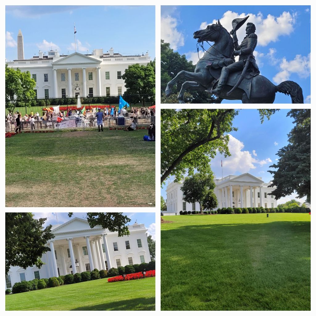 On a marché 17 kilomètres et nous sommes revenus à pied. Nous allons voir la Maison Blanche et je réalise qu’elle se trouve en centre ville. Devant son jardin et derrière les grilles une large route qui permet les défilés et les manifestations. Un square surplombe le bâtiment qui a de jolies proportions. Le quartier regorge de bâtiments magnifiques. C’est une ville relativement calme . Quelques rues résidentielles et de jolies maisons.
