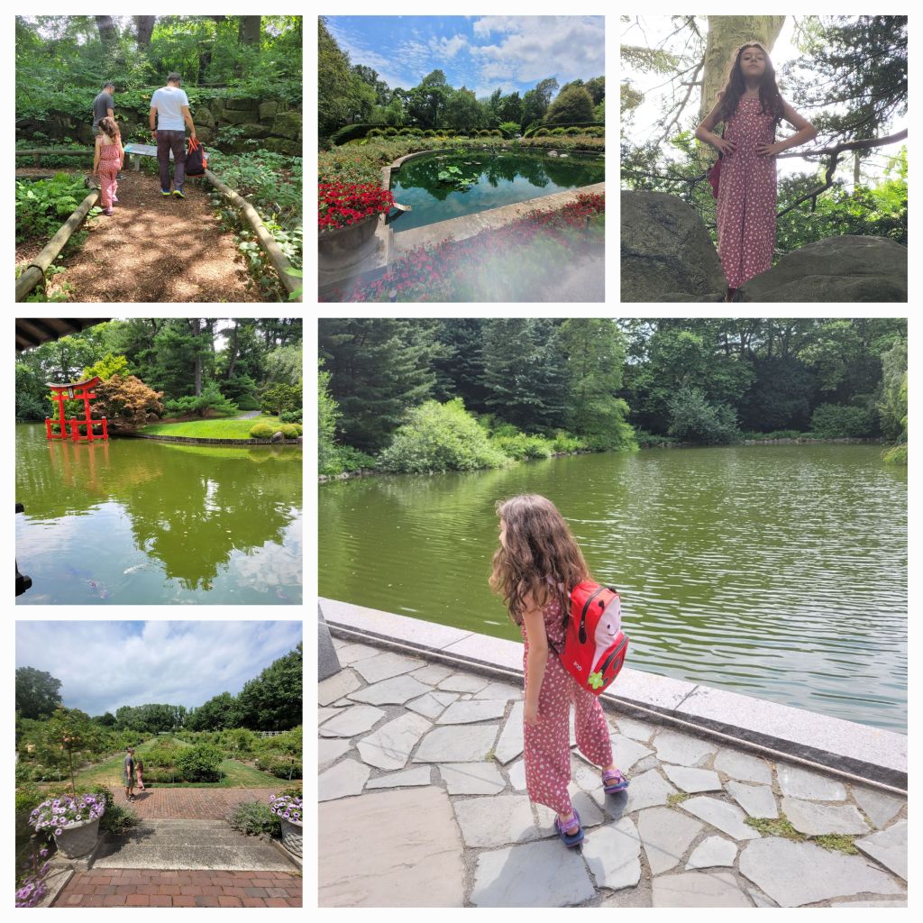 Nous partons au Brooklyn Botanic Gardon. Ionie ma cousine de 8 ans connait ce jardin par coeur. Le jardin a une superficie de 21 hectares. Il a été créé en 1910. Il accueille chaque année 900 000 visiteurs et présente 10 000 plantes. Il est 15h30 un samedi et il y a peu de monde. Une belle roseraie présente les variétés de roses avec des noms amusants comme Superhéros. Un jardin japonais avec des carpes koï et des tortues. C’est un lieu apaisant et un grand plaisir de m’y promener avec mes cousins.
