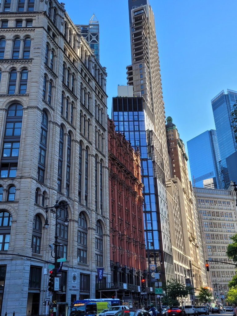 Ce matin nous décidons d’aller à Manhattan, nous allons passer le pont de Brooklyn à pied. Il s’agit d’une promenade de 2 kilomètres. Nous traversons des quartiers très différents avant d’arriver au pont. Ici des immeubles superbes et de magnifiques maisons à 2 étages et quelques rues plus loin des quartiers où il n’est pas prudent d’aller seul le soir. Ma cousine américaine Joan me confirmera que tout n’est pas « secure » comme je me l’imagine. Sa fille Rebecca me confirmera que Brooklyn est aujourd’hui le quartier des jeunes hipsters, des artistes, des intellectuels et qu’on passe facilement le pont de Brooklyn en venant de Manhattan pour sortir le soir au restaurant. Elle y habite depuis 15 ans. Comme mon autre cousine Dana que nous verrons demain.