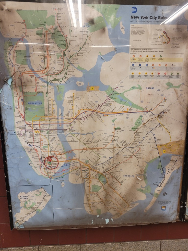 Nous aurons battu un record : 20 kilomètres. Au pont de Brooklyn nous prenons le métro à Fulton, notre ancien pied à terre il y a 2 ans et les meilleures pizzas de New-York : Joe’s pizza !
