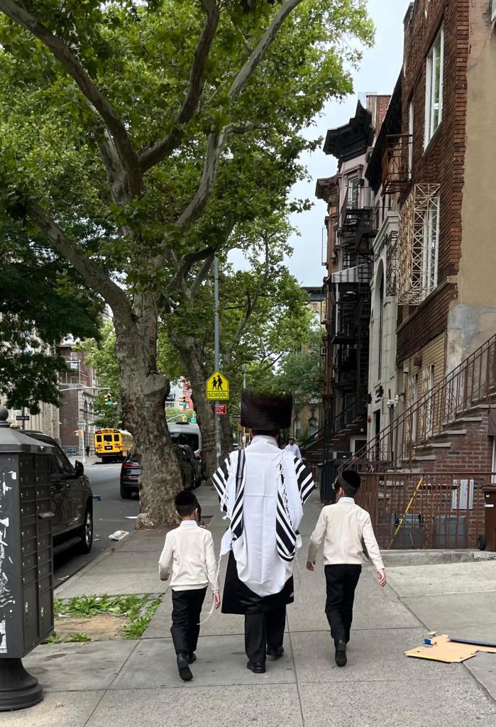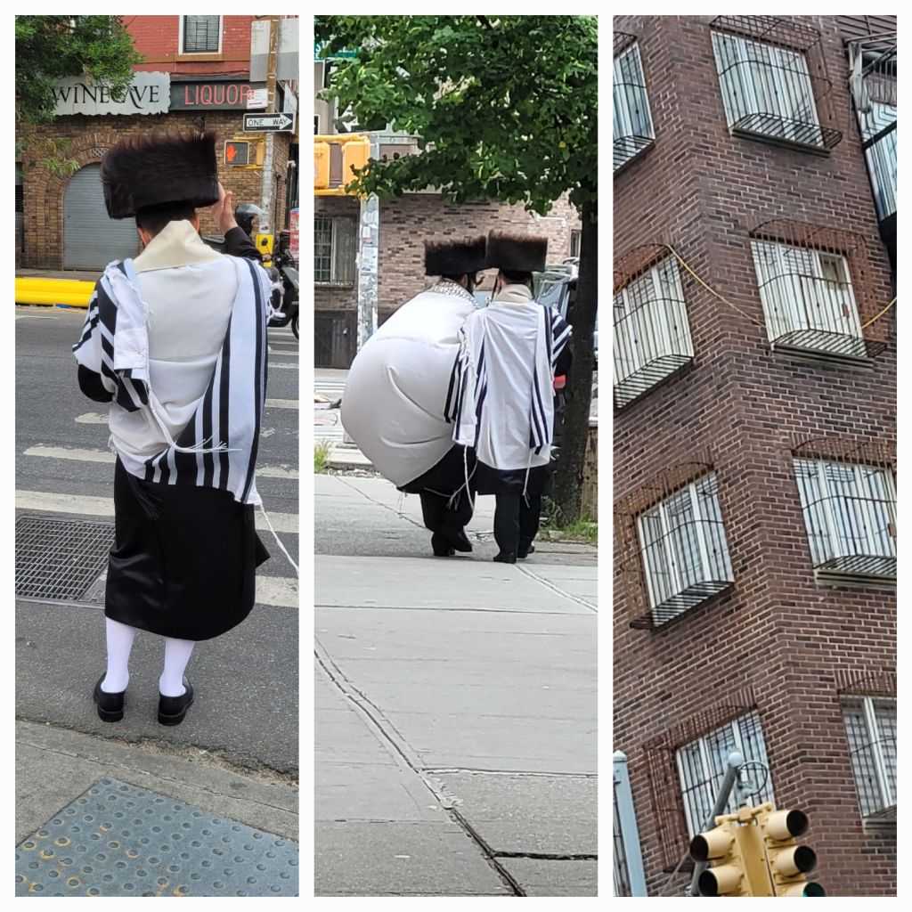Nous partons de l’Avenue Madison pour remonter vers Williamsburg, lieu d’un nouveau déjeuner avec mes cousins. Nous traversons le quartier orthodoxe de Brooklyn. Personne dans les rues c est jour de Sabbath…que des hommes, des adolescents et des petits garçons…PEU de femmes, filles…elles n ont pas le droit de prier… Des manteaux redingote noirs, de grands chapeaux et des bouclettes qui défigurent ces visages juvéniles. Des barreaux aux fenêtres, toutes les fenêtres, de tous les immeubles. Un sentiment étrange…Ils sont en majorité habillés en noir. Le noir représente l’espoir et le blanc plutôt le désordre. On voit les tsitsits dépasser : on voit dépasser des franges ou des tresses d’un tissu enroulé à la taille. Seuls les hommes le porte. Les hommes portent ces larges chapeaux appelés le schtreimel pendant le shabbat et les autres célébrations. Des jeunes filles portent des fichus et de longues robes évasées car il est interdit d’apercevoir des formes. Je pense à la série « Un Orthodox » et je me demande quel espace de liberté ont ces enfants et ces femmes face à ces préceptes si rigoureux…